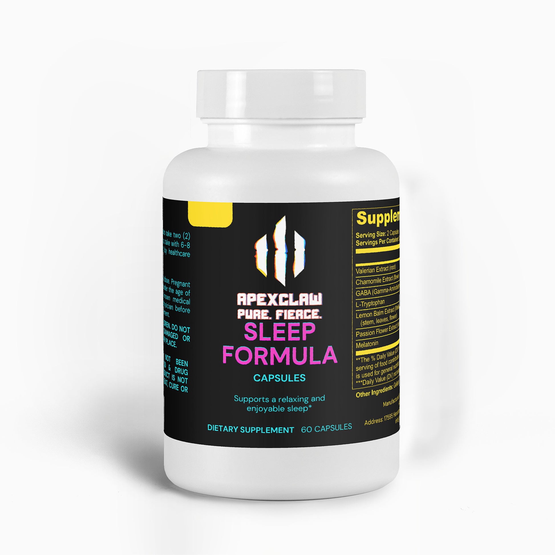 Ingredients: Valerian Extract (root); Chamomile Extract (flower); GABA (Gamma-Aminobutyric Acid); L-Tryptophan; Lemon Balm Extract (Melissa officinalis) (stem, leaves, flower); Passion Flower Extract (stem, leaves, flower); Melatonin